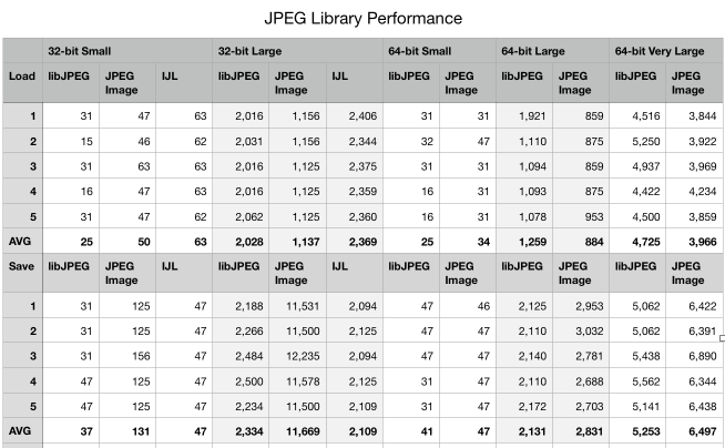 64-bit 환경에서도 TJPEGImage가 libJPET-Turbo 대비 큰 이미지의 경우 30%, 매우 큰 이미지의 경우 약 17% 가량 성능이 좋은 것으로 확인했습니다.