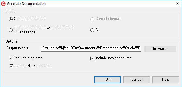문서화 범위(Scope) 및 옵션(Options)를 선택 후 [OK] 버튼을 클릭 합니다.
