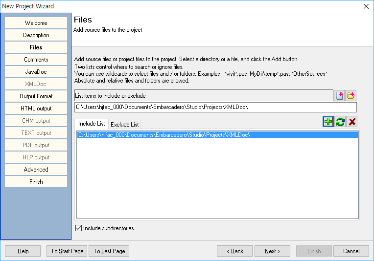 마법사 페이지에서 옵션 설정 및 대상 파일(또는 디렉토리) 선택 및 추가 후 [Finish]