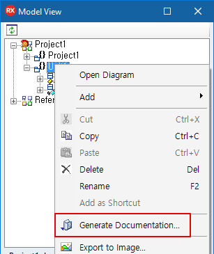 Model View에서 문서화할 대상(프로젝트 또는 유닛) 선택 후 팝업메뉴에서 "Generate Documentation..." 메뉴를 선택 합니다.