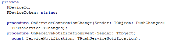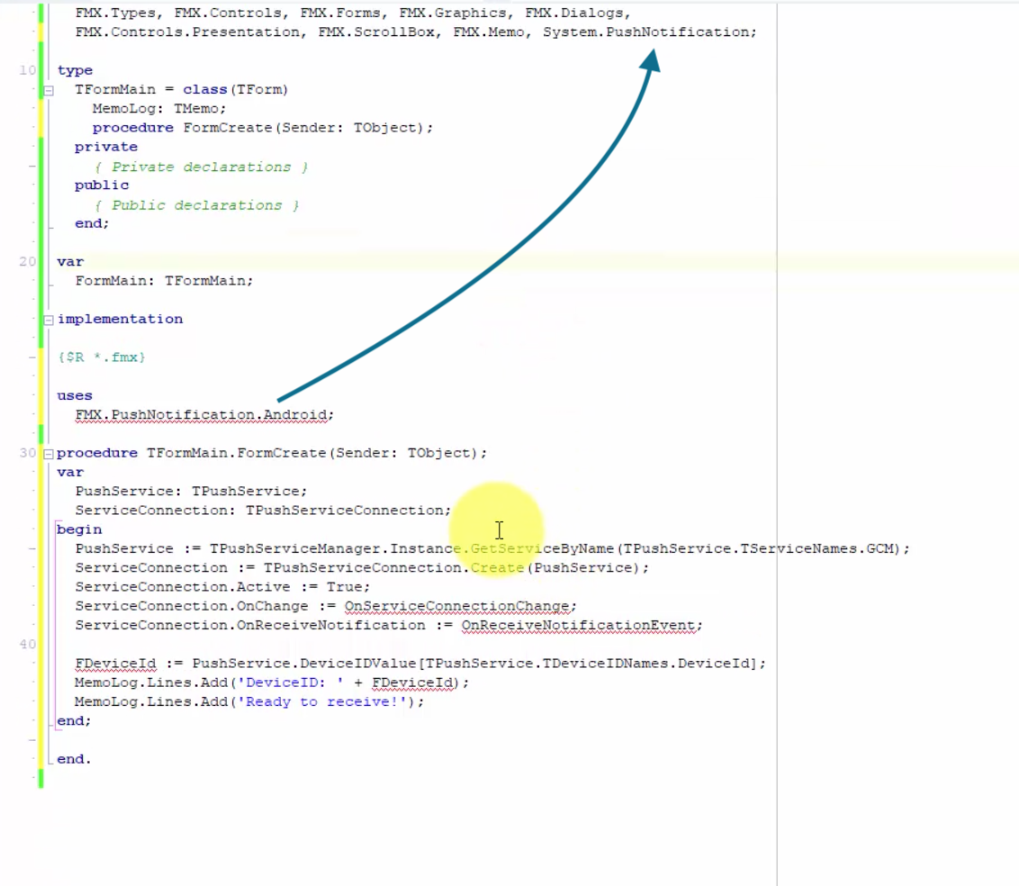 또한, interface uses 절에 System.PushNotification을 추가합니다.