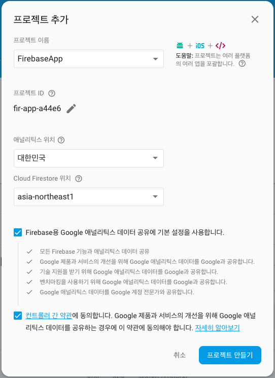 - 프로젝트 이름은 임의로 설정(예> FirebaseApp)