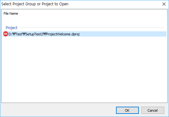 RAD 스튜디오에 프로젝트를 열수 있는 화면이 표시되면, 프로젝트를 선택 후 [OK] 버튼을 클릭해 프로젝트를 엽니다.