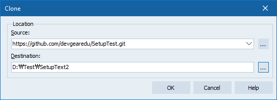 Source 항목은 깃 허브에서 클립보드로 복사한 주소를 붙여넣기(Ctrl + V) 후 Destination 항목에 저장할 로컬 경로 선택 후 [OK] 버튼을 클릭합니다.