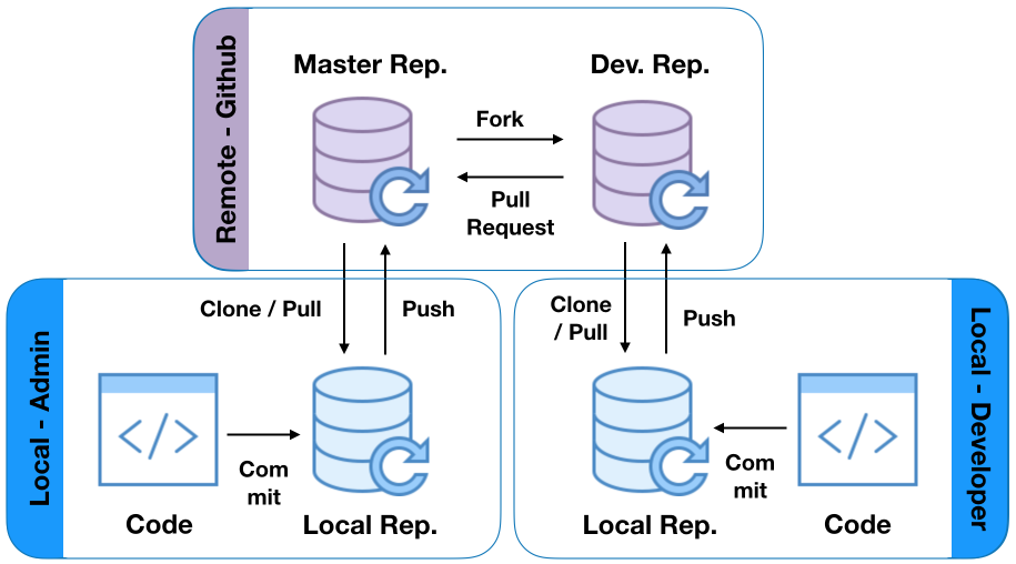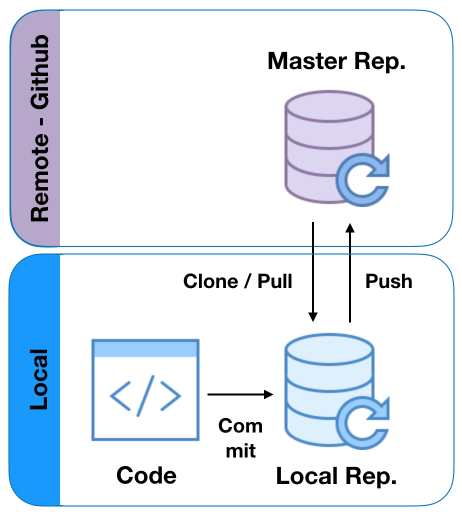 깃 저장소는 위 그림과 같이 원격(Remote-Github) 저장소와 로컬(Local) 저장소로 분산되어 운용됩니다.