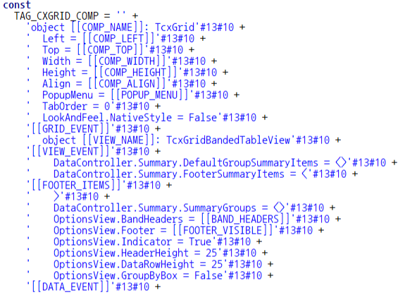 다음과 같이 퀀텀그리드(TcxGrid) 컴포넌트 문자열 템플릿 상수를 정의 했습니다.