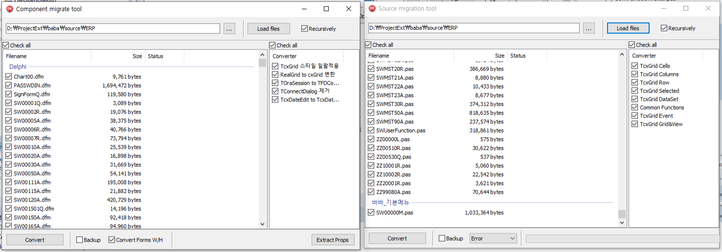 마이그레이션 자동화 도구는 델파이 소스파일을 분석해 컴포넌트를 변경하고, 컴포넌트를 사용한 소스코드를 일괄 변경하는 도구입니다.