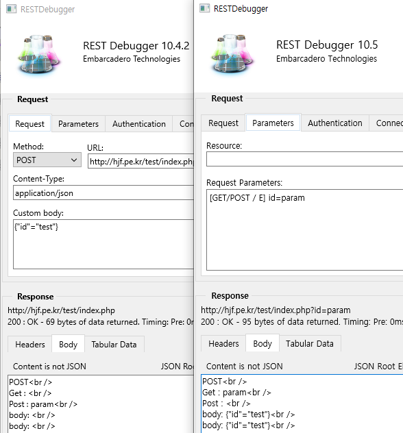 위와 같이 지정 후 REQUEST 실행하면 다음과 같이 10.4.2와 동일한 방식으로 POST 파라메터로 전송되는 것을 확인할 수 있습니다.