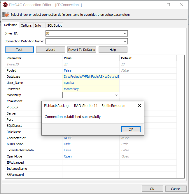 - Object Inspector에서 TFDConnection의 LoginPrompt 속성을 "False"로 변경