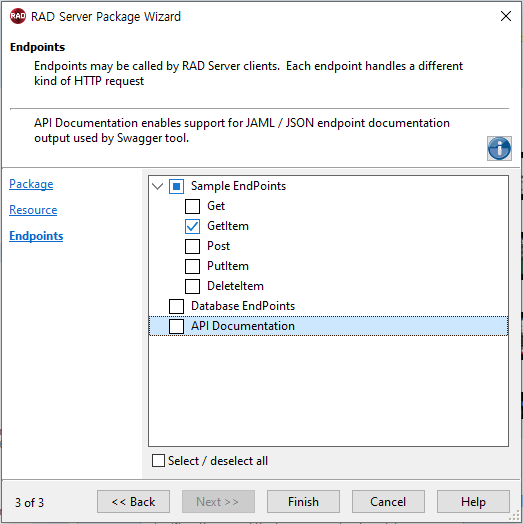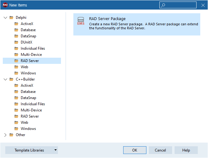 - Delphi > RAD Server > RAD Server Package 선택 > [OK] 버튼 클릭