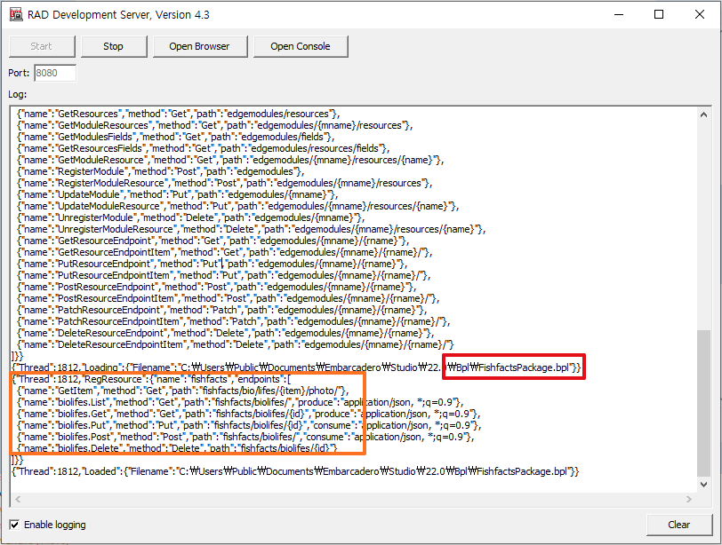 {"Thread":1812,"Loading":{"Filename":"C:\Users\Public\Documents\Embarcadero\Studio\22.0\Bpl\FishfactsPackage.bpl"}}- 우리가 생성한 RAD 서버 패키지가 로드 된 것을 확인